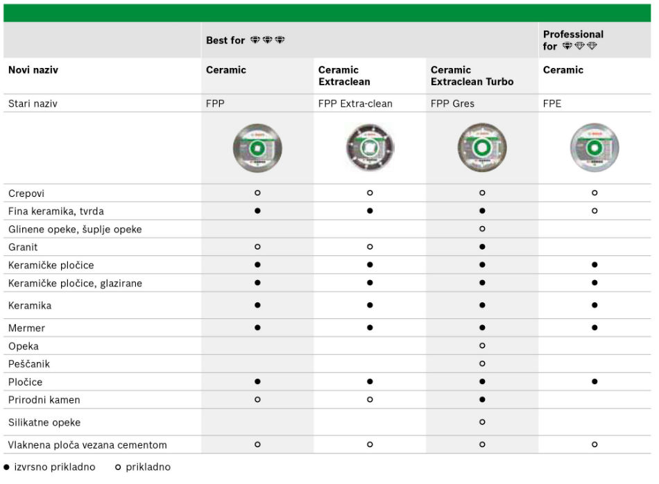 Pogledajte tablicu preporučenih materijala samo za proizvod FPE, ostale proizvode iz tablice ne prodajemo.