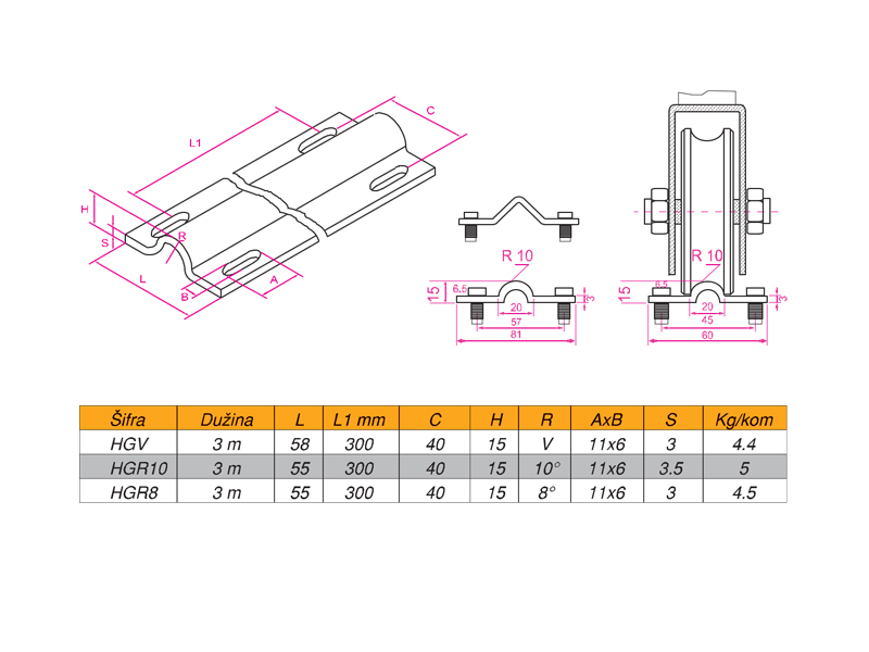 Nosač sa dve rolnice uži 220x35x4 mm