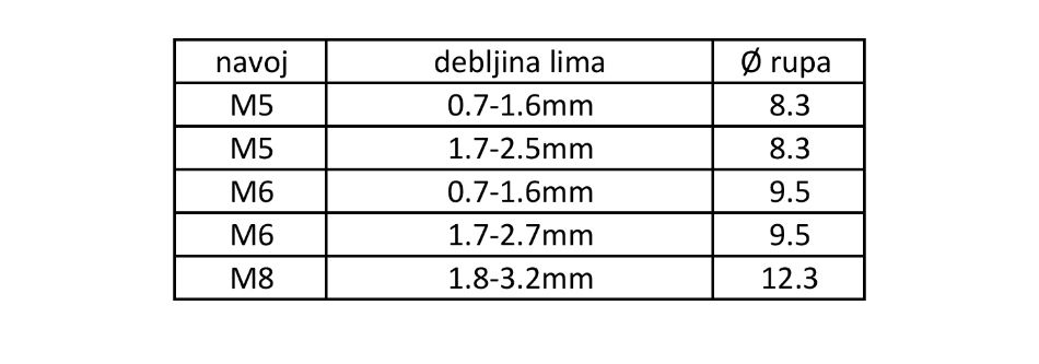 Tablica sa proizvoda, debljine i rupe lima