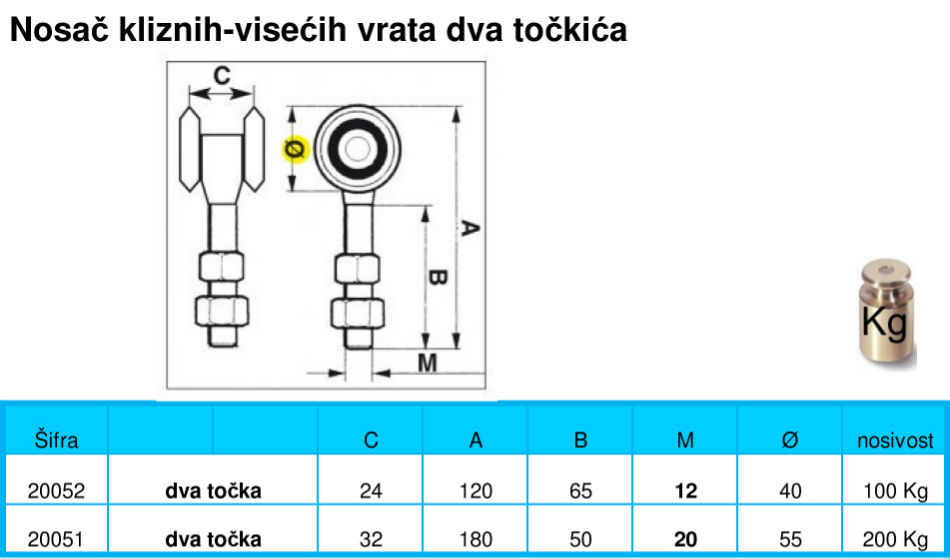 Nosač kliznih visećih vrata sa 2 točka M12 sa točkom fi 40mm ili M20 sa točkom fi 55mm. Gore pogledajte "Kako pronaći odgovarajuću šinu"