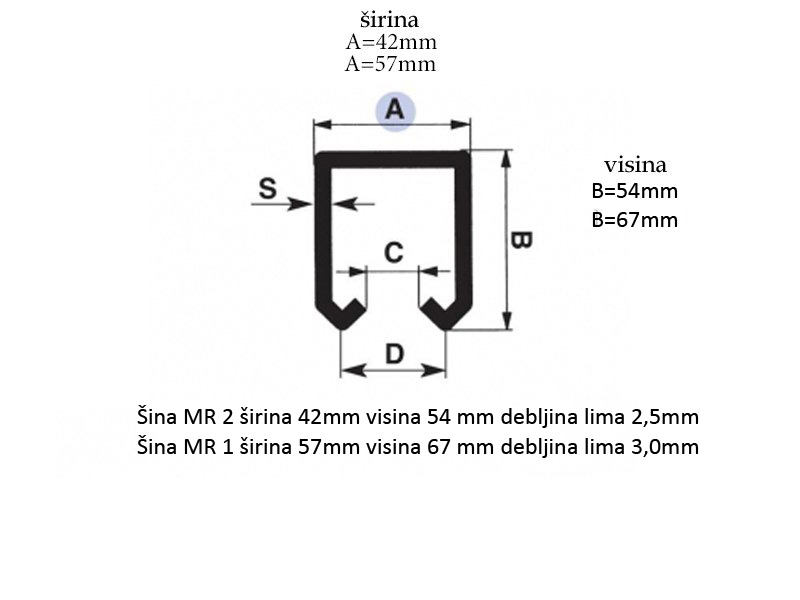 Ako želite da vam se šina pošalje kurirskom službom,to je moguće samo ako se iseče na pola. U tom slučaju morate u porudžbini naglasiti da ste saglasni sa sečenjem. A veličina 42mm x 54mm debljina lima 2,5mm, B veličina 57mm x 67mm debljina lima 3,0 mm .