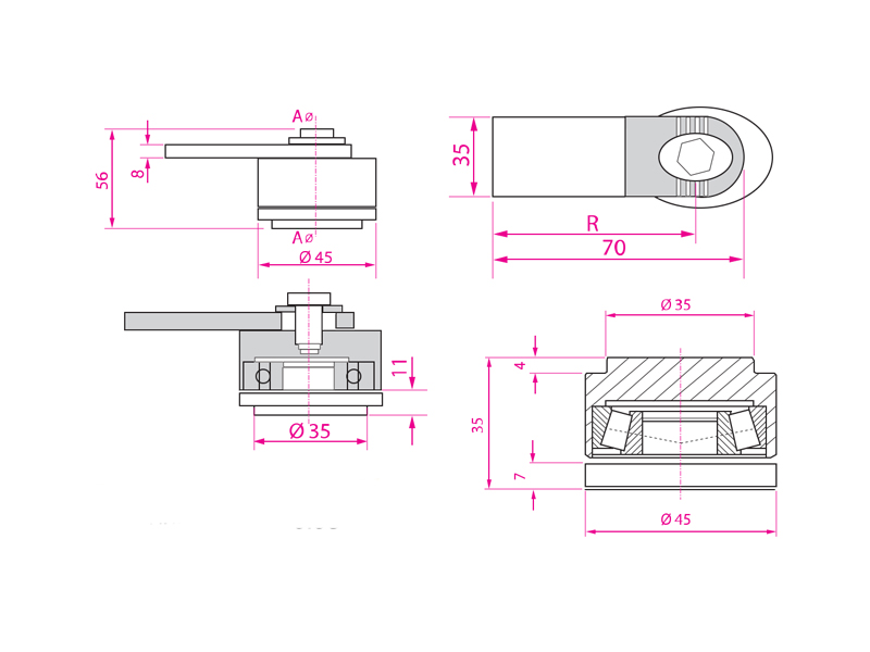 Tehnički crtež se odnosi za komplet donja + gornja šarka.Slika nosi primer sarke fi-45mm