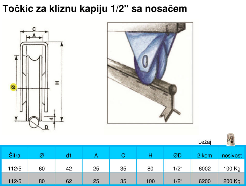 Točkić za kliznu kapiju 1/2" sa nosačem