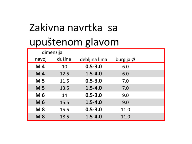 Zakivna navrtka. Blind navrtka. Materijal čelik. Navrtka sa unutrašnjim navojem i upuštenom glavom.Zbog debljine lima na koju se fiksira postoje sa "konusnom" i "malom konusnom" glavom.